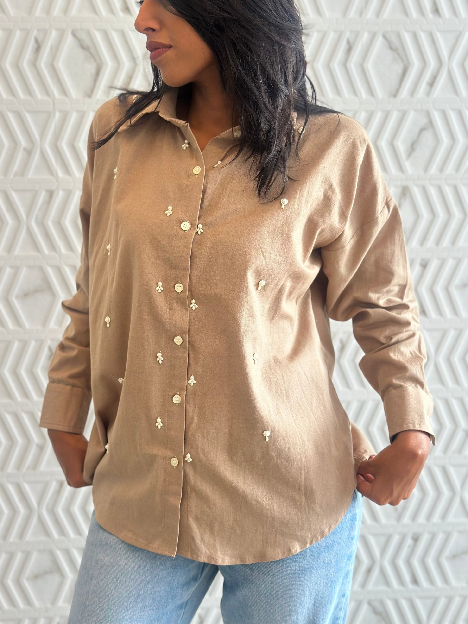 • Pearl drops detailing in the front